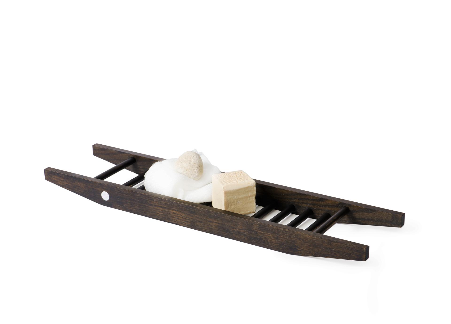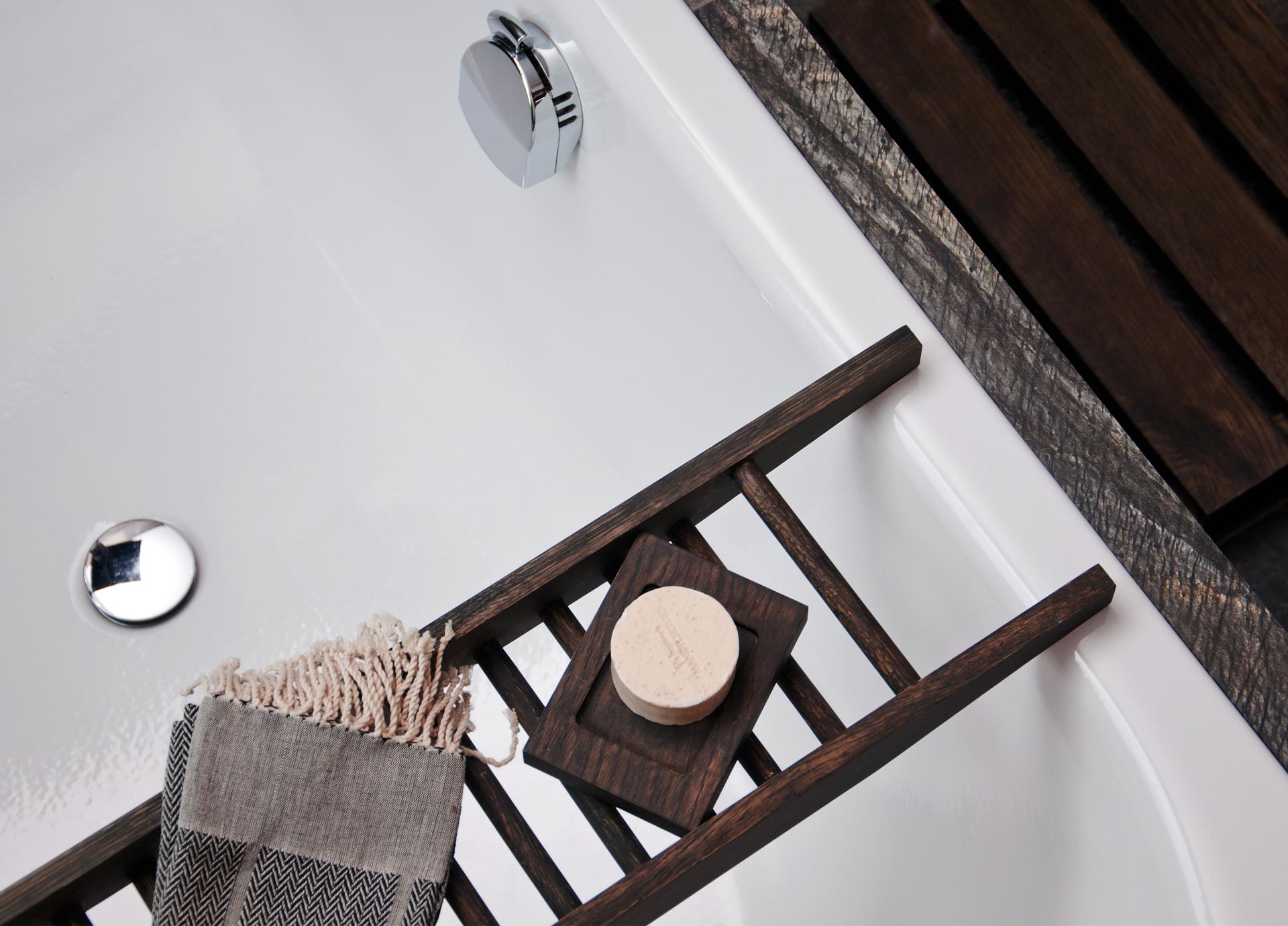 Bath Bridge Studio is  a popular over-bath toiletry storage method. This sleek construction uses dark stained solid oak and is designed to sit level on all baths up to 70cm span.