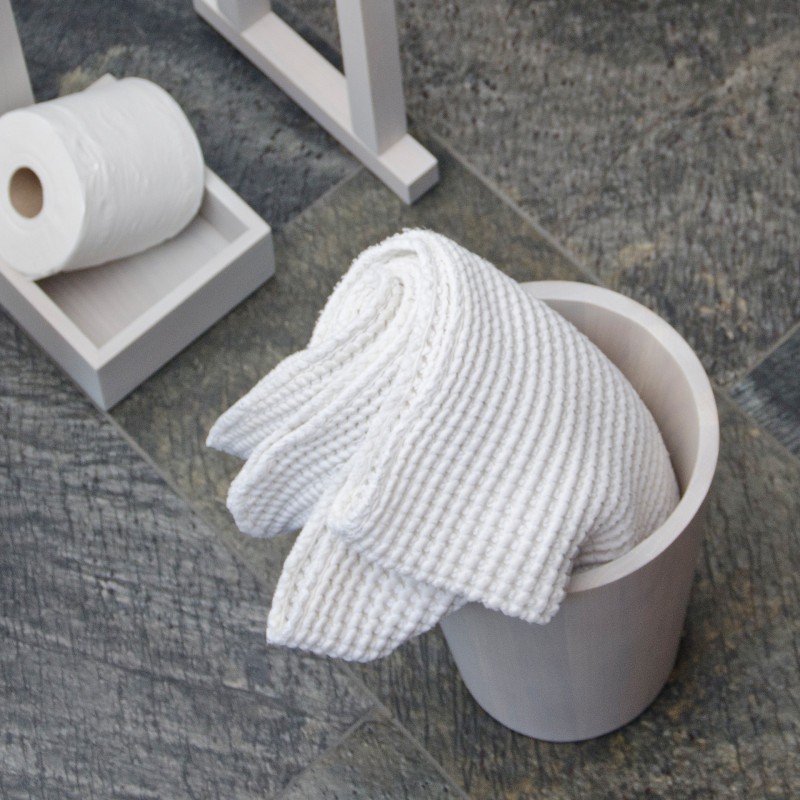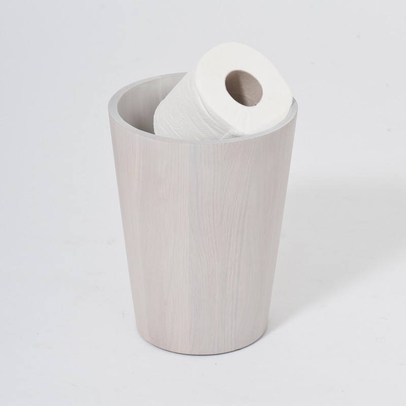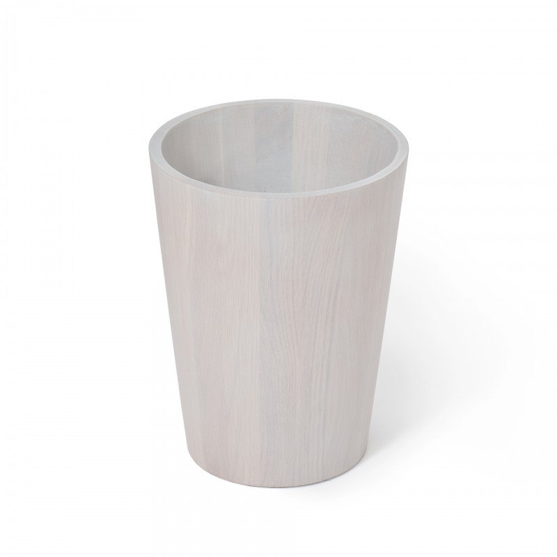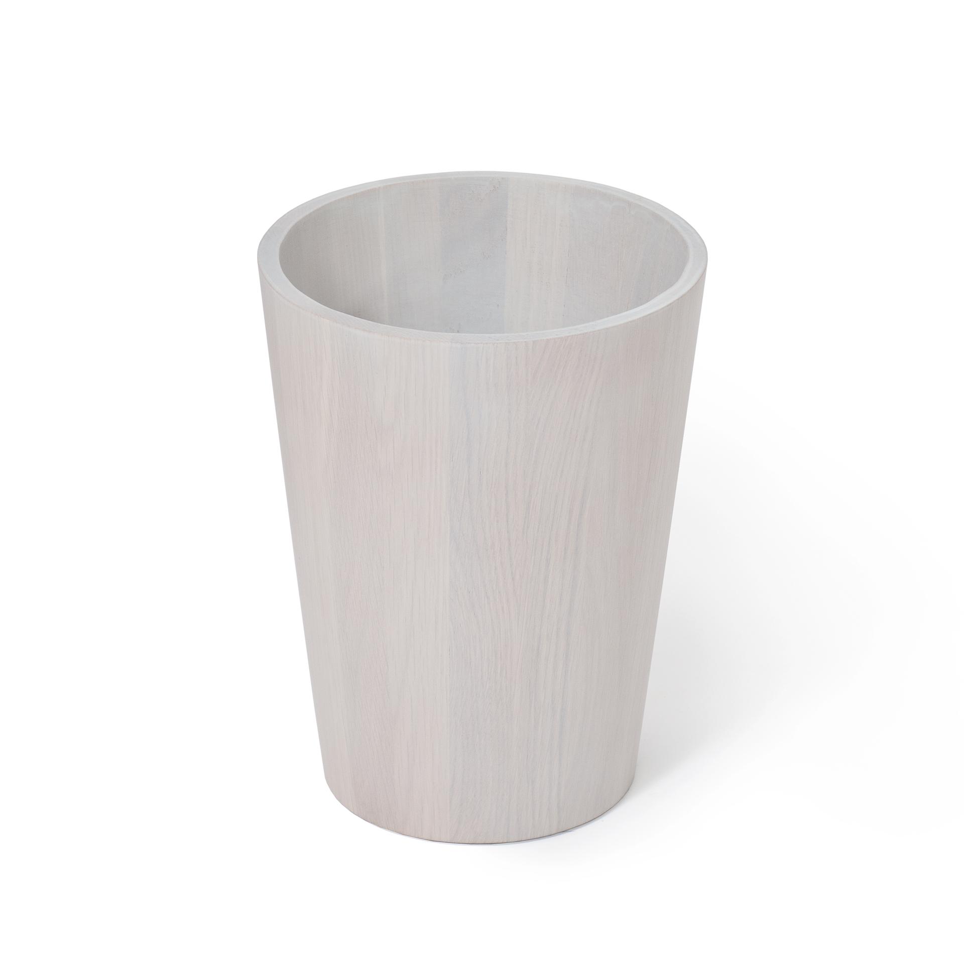 Individually assembled by hand, eighteen blocks of solid American white oak are laminated to form the conical shape. A squared top and bottom edge cut a contemporary look. Perfect for use in a bathroom, bedroom or office. The surface can be easily cleaned inside and out with a soft damp cloth and soapy solution.