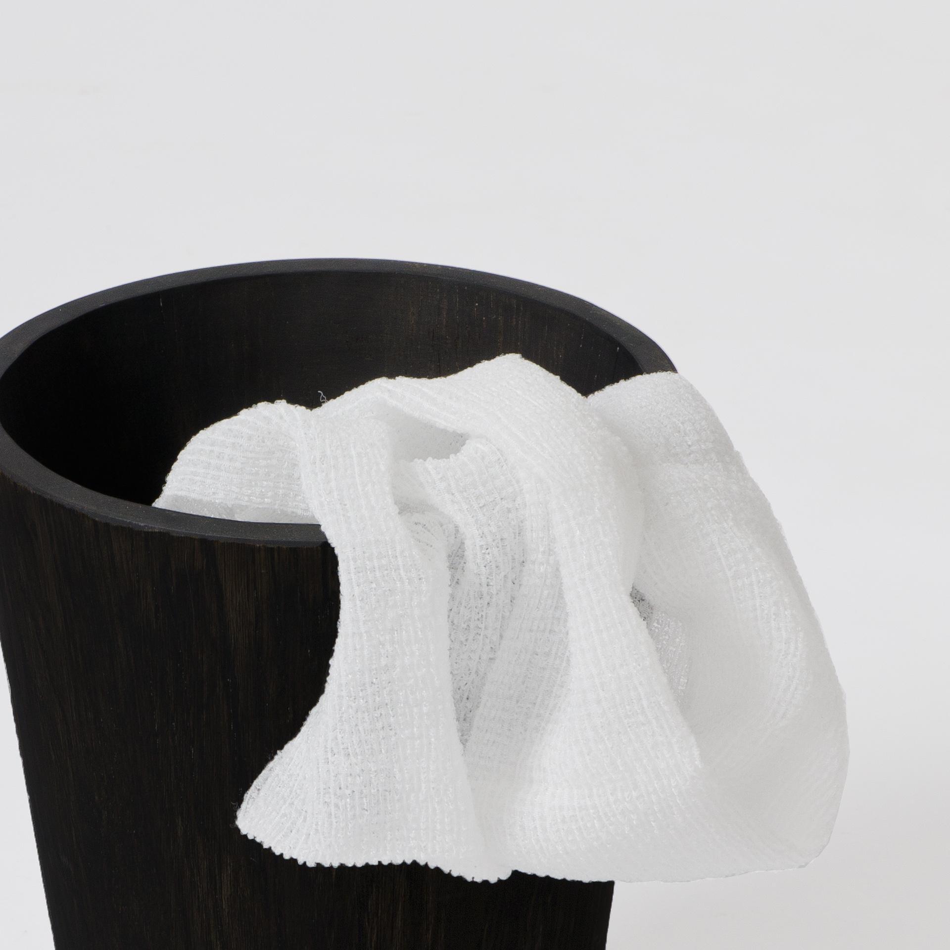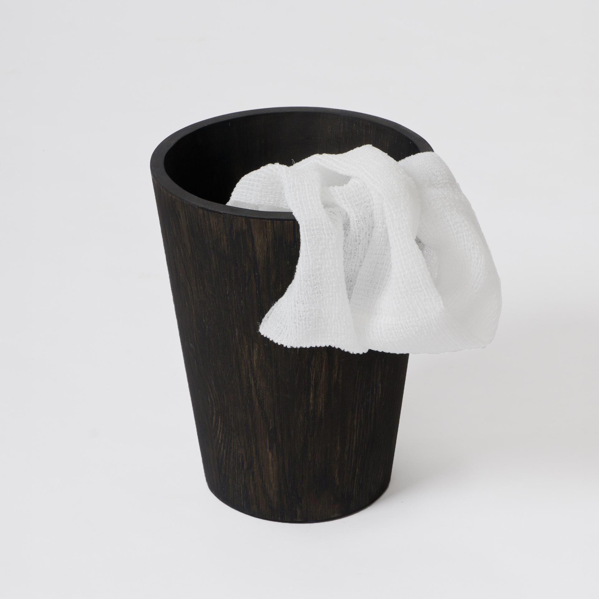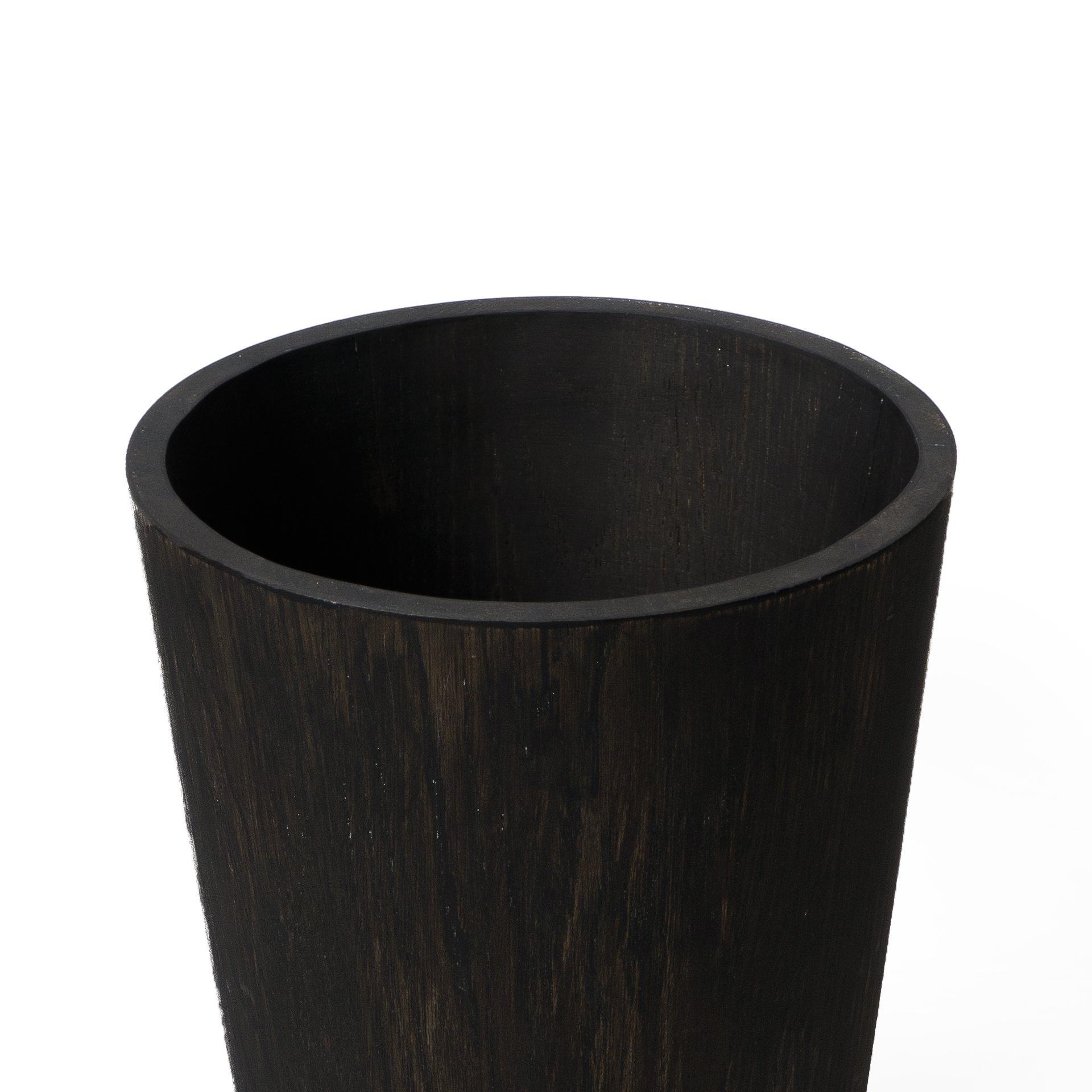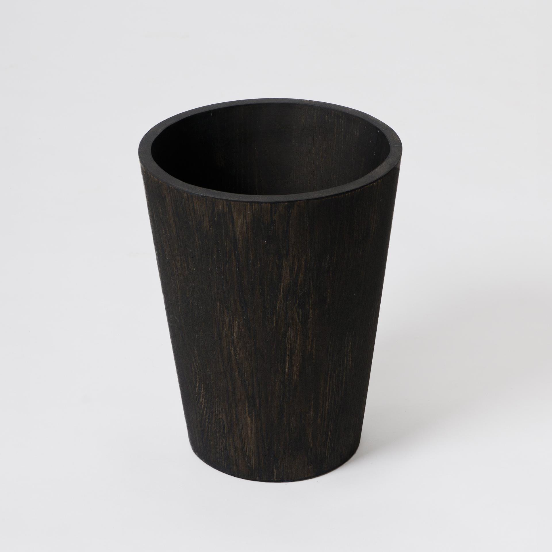 Individually assembled by hand, eighteen blocks of solid American white oak are laminated to form the conical shape. A squared top and bottom edge cut a contemporary look. Perfect for use in a bathroom, bedroom or office. The surface can be easily cleaned inside and out with a soft damp cloth and soapy solution.