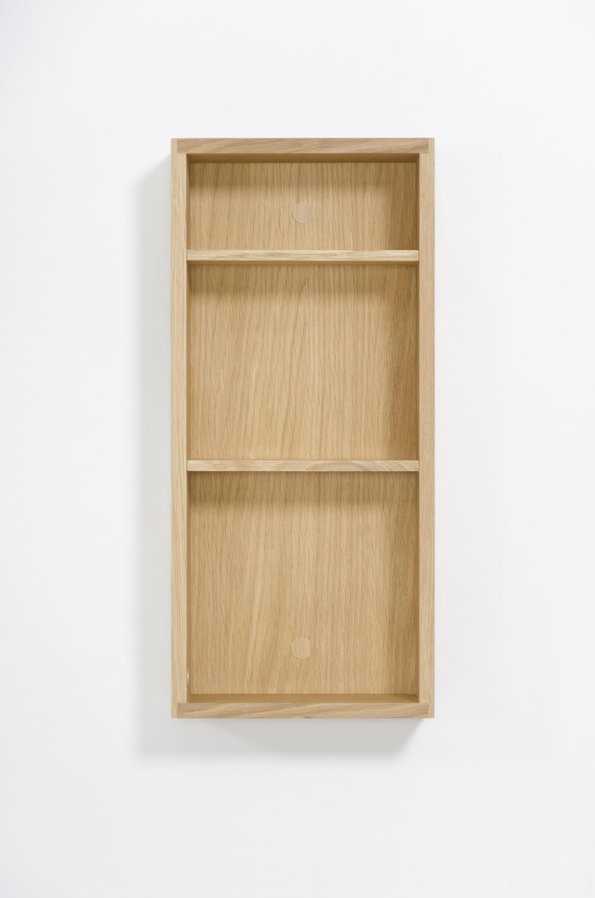 Slimline box shelf is made from sustainably harvested, natural American white oak and oak veneers, selected for their warm colour, beautiful grain pattern and traditional hardwood durability. All edges look crisp but are carefully hand sanded to make them soft to the touch. Finished with a matt, water resistant lacquer. Design by Lincoln Rivers.