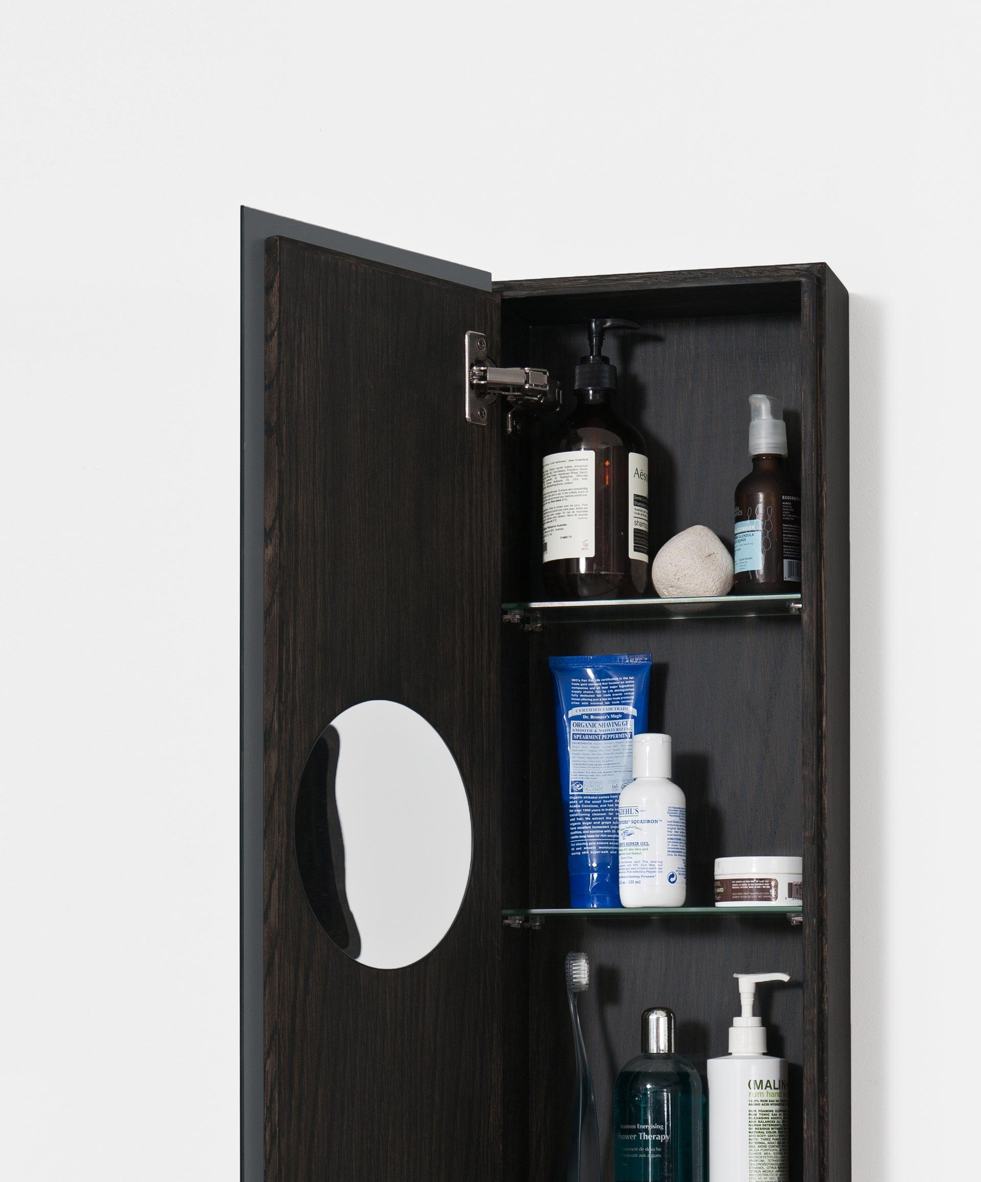 The cabinet can be fixed for either left or right hand opening. A full edge rebate extends on three sides to make door opening easy. Inside there are six moveable, polished, tempered glass storage shelves.