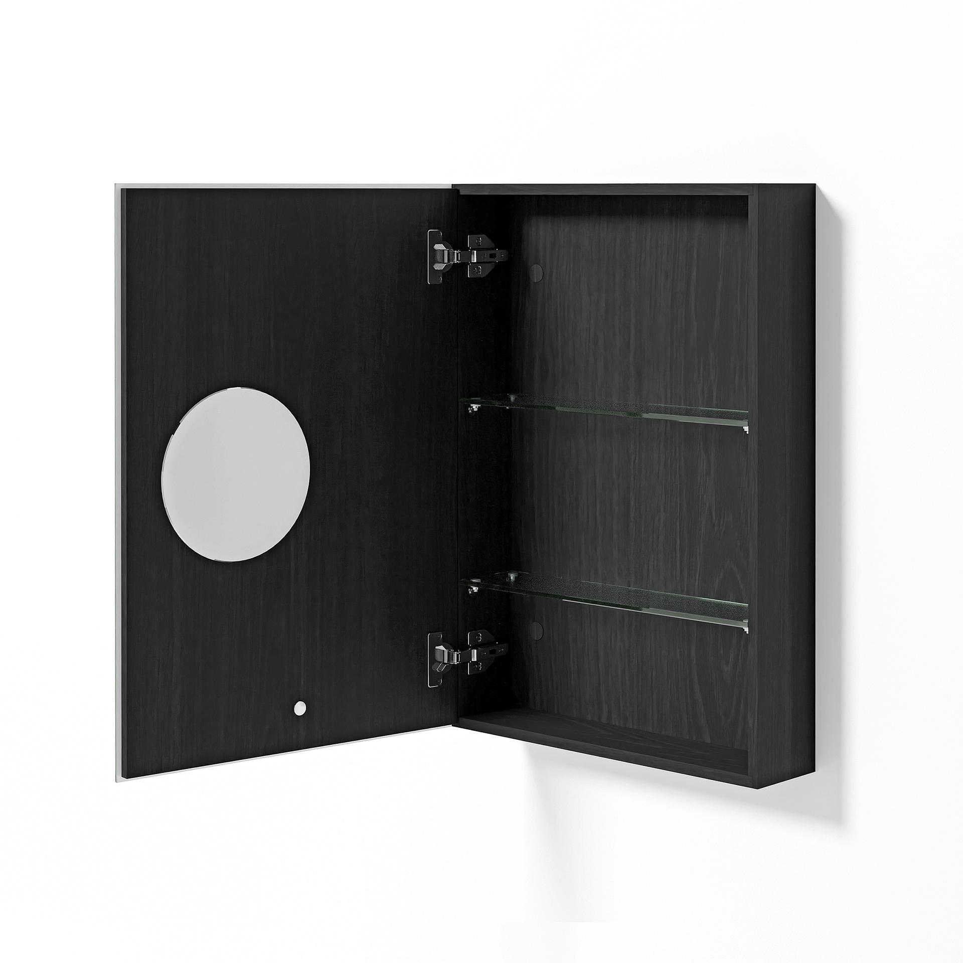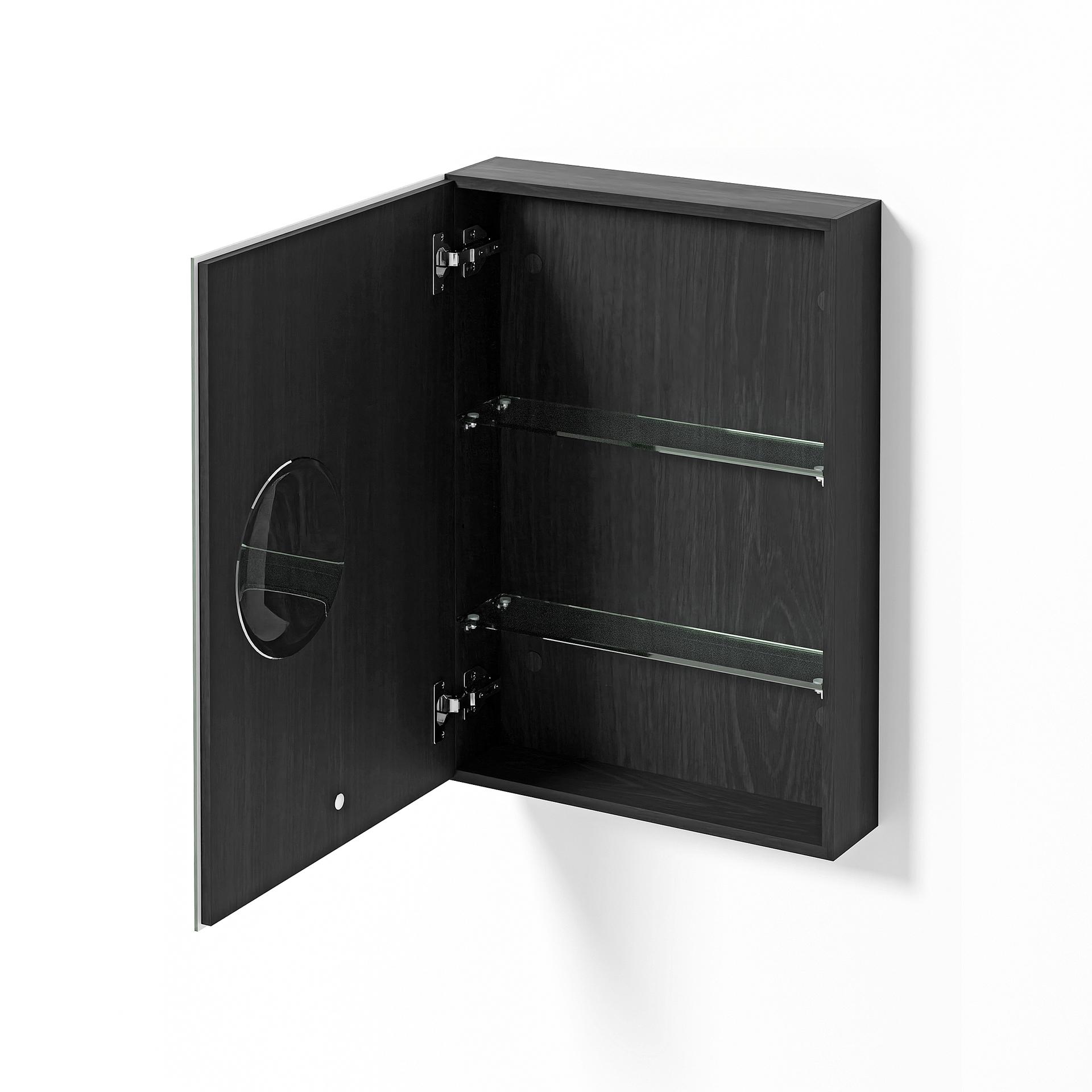 Slimfit 600 is a contemporary style, capacious, single door bathroom mirror cabinet. A slim profile means the cabinet does not stick out too far from the wall. Mounted inside the door is a times five magnification vanity mirror, very useful for when applying make up or wanting an enhanced view. The mirror door appears to fit flush with the carcass but a slim finger rebate across the bottom and top makes opening the cabinet easy. Adjustable hinges make it possible to fine-tune the door fit and are ‘soft close’ to stop the door from slamming.