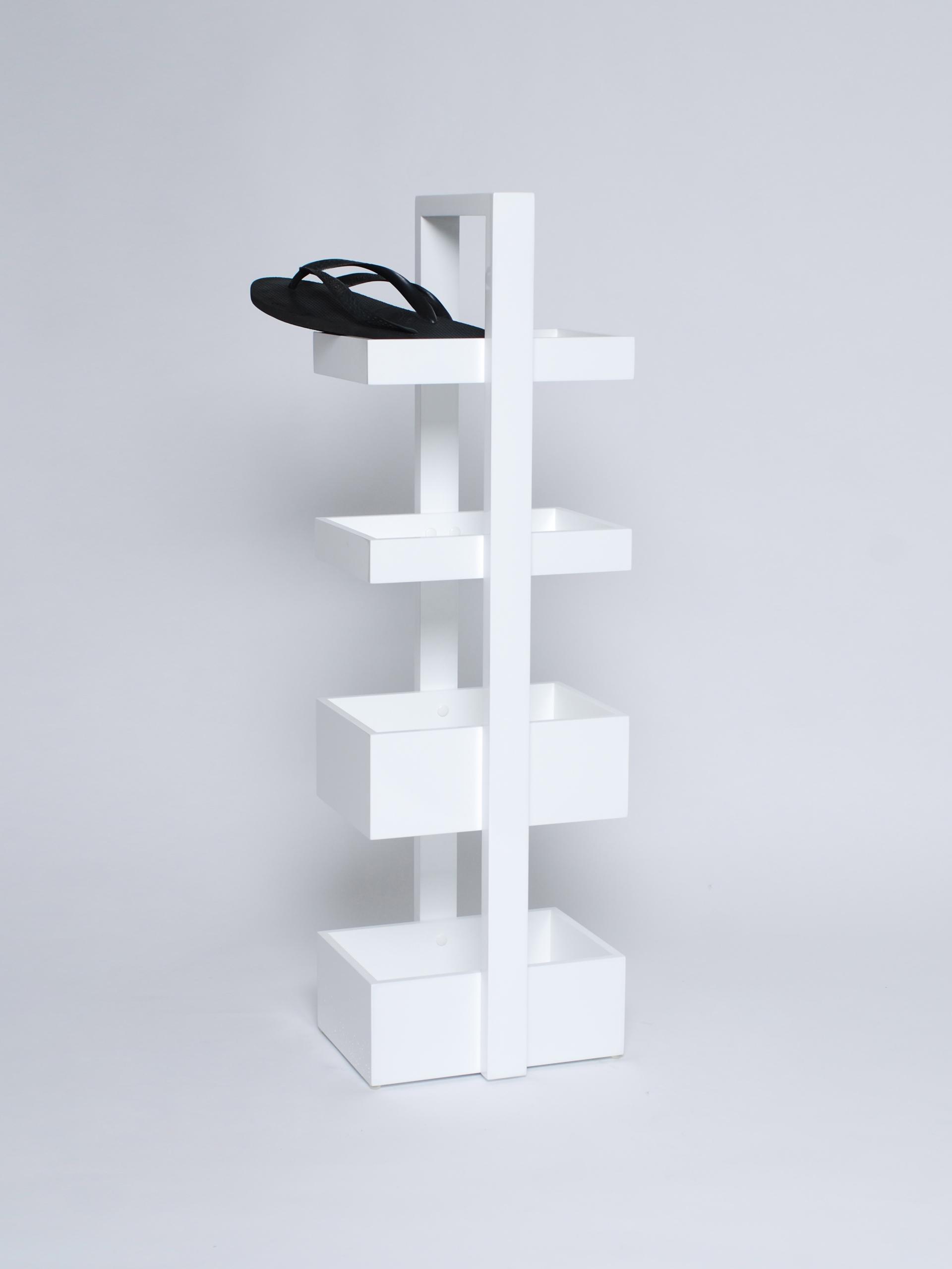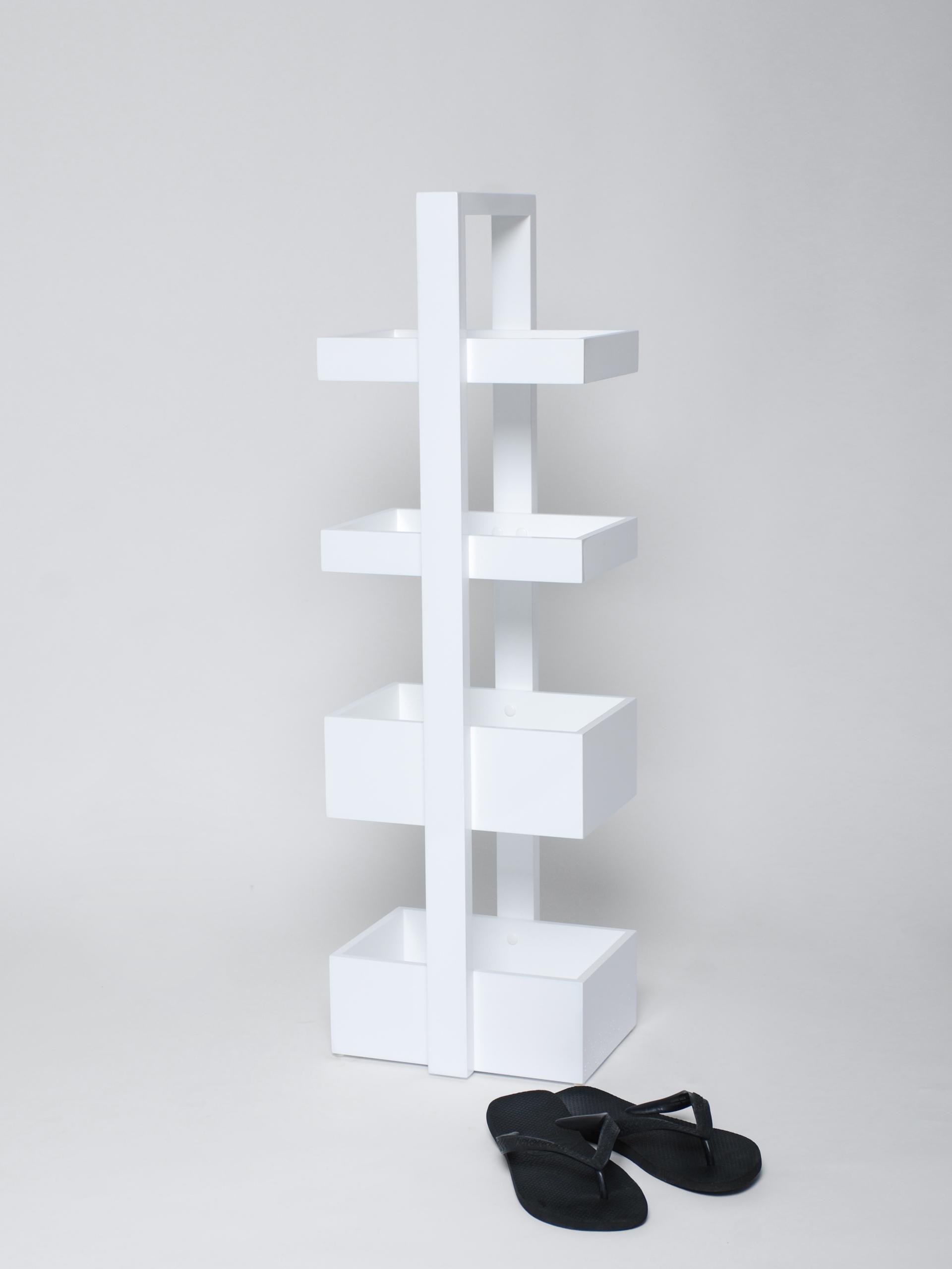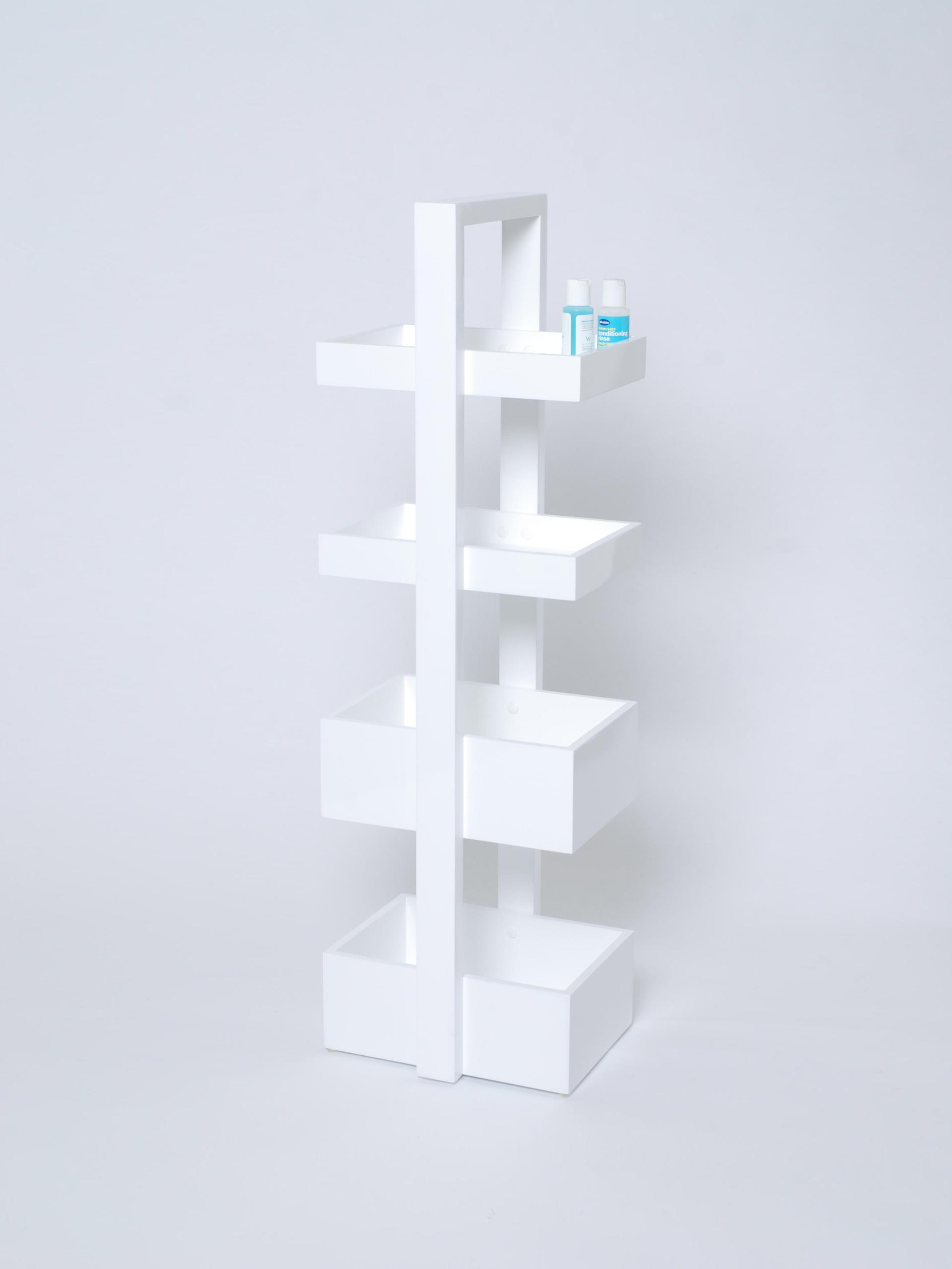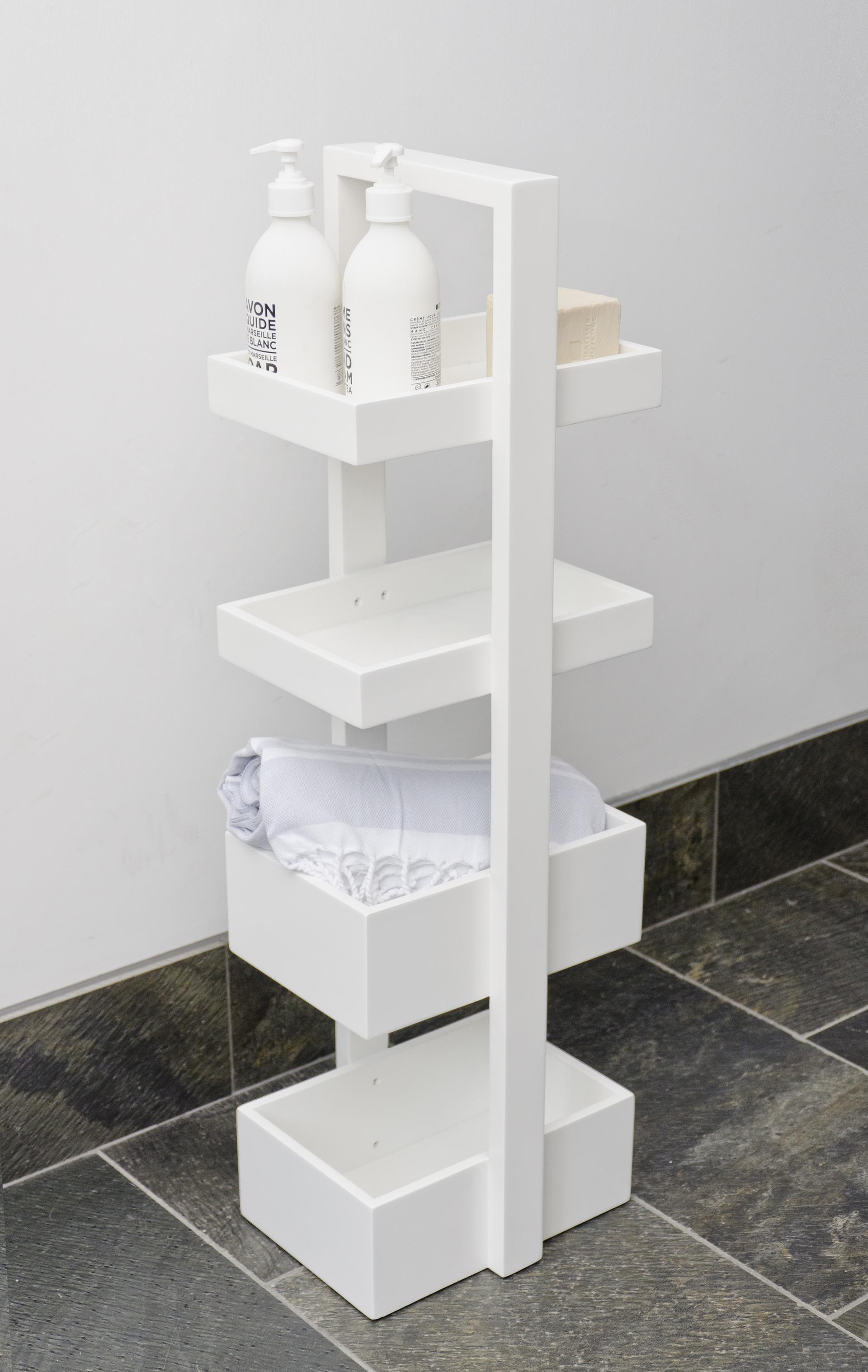Stunningly finished in a super shiny, sleek, smooth gloss, epoxy white. Supremely functional the design provides four trays for storage, two slim trays at the top and two deeper trays below. Ideal for rolled towels, body lotions, toiletries and gels.