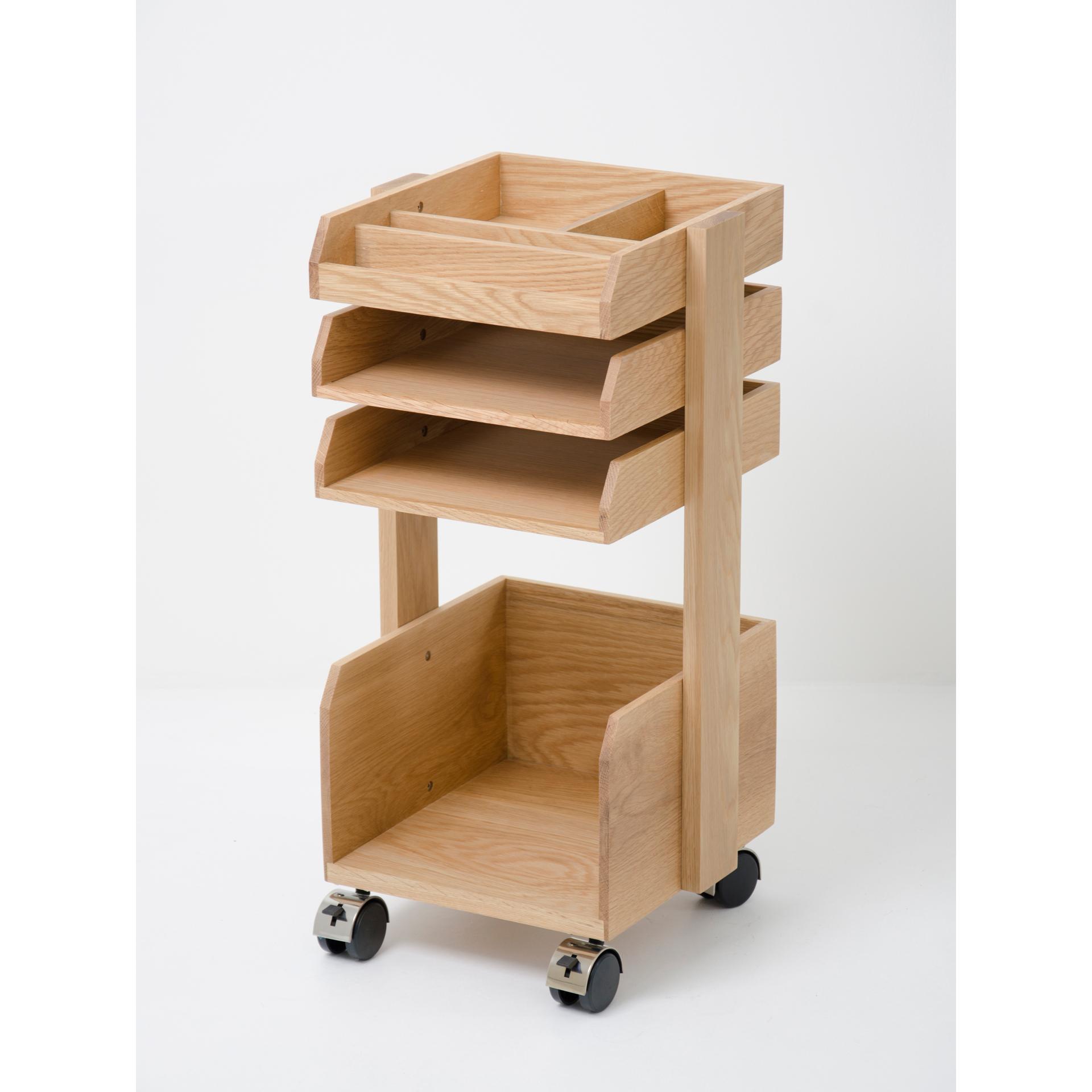 The top tray is divided into four compartments. For the home office you might store pens and stationery items. Next to a dressing table it’s make-up, a hair-dryer and accessories. As a hobby cart it might be tools and components.