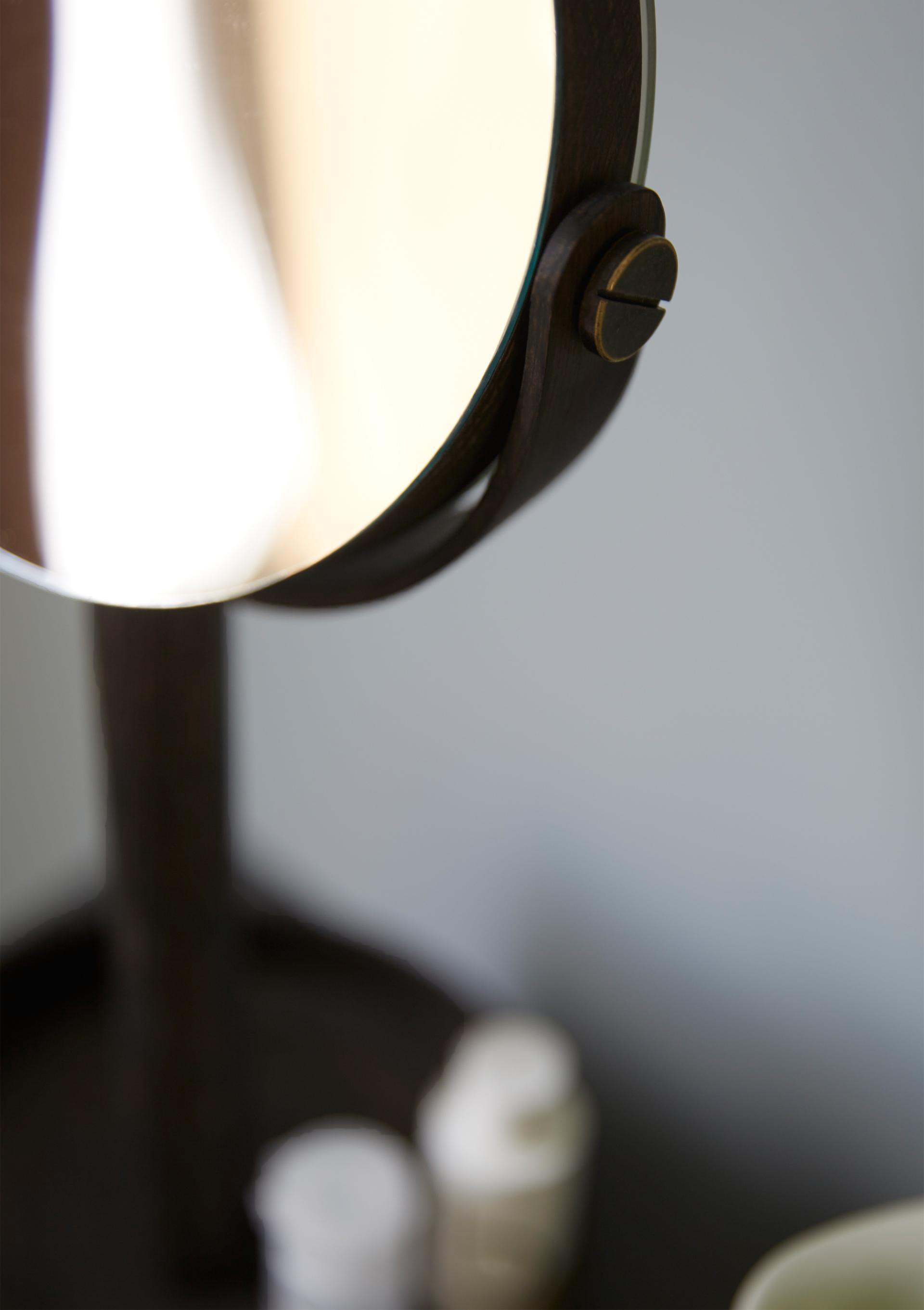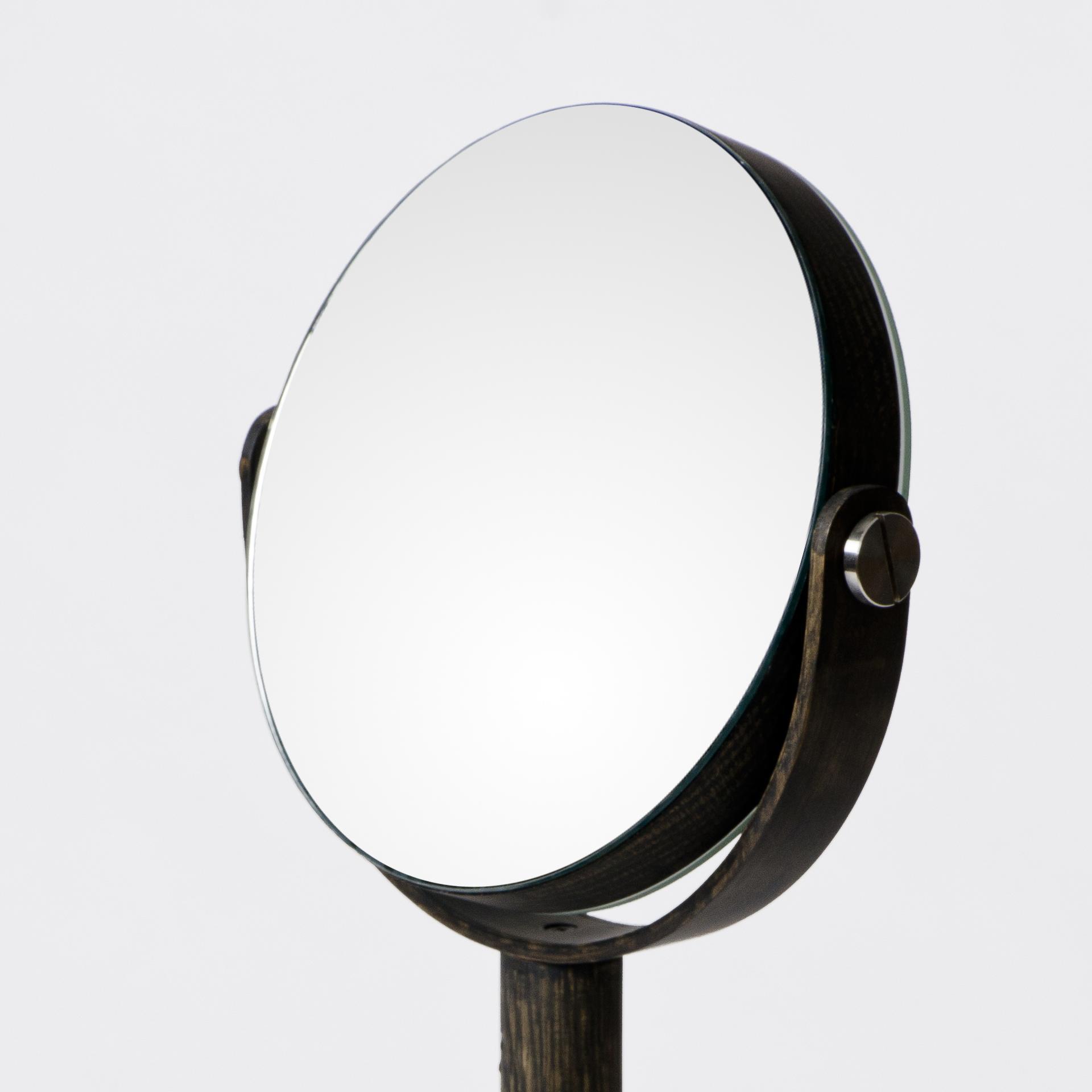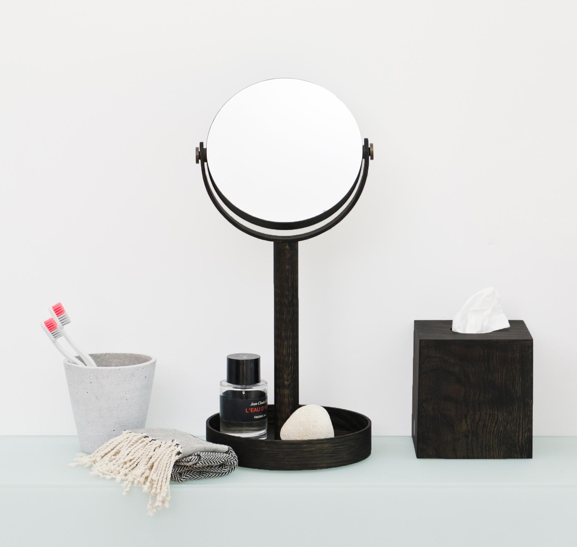 Close Up's pivoting magnifying mirror adjusts to the angle you desire. There's a choice of plain mirror on one side and a x5 magnification mirror on the other. The tall wood stand positions the mirror at a usable height; you won't have to hunch over. The round base is edged and can be used as a tray to hold your personal items like make-up, nail polish or contact lens cases, it's also very stable.