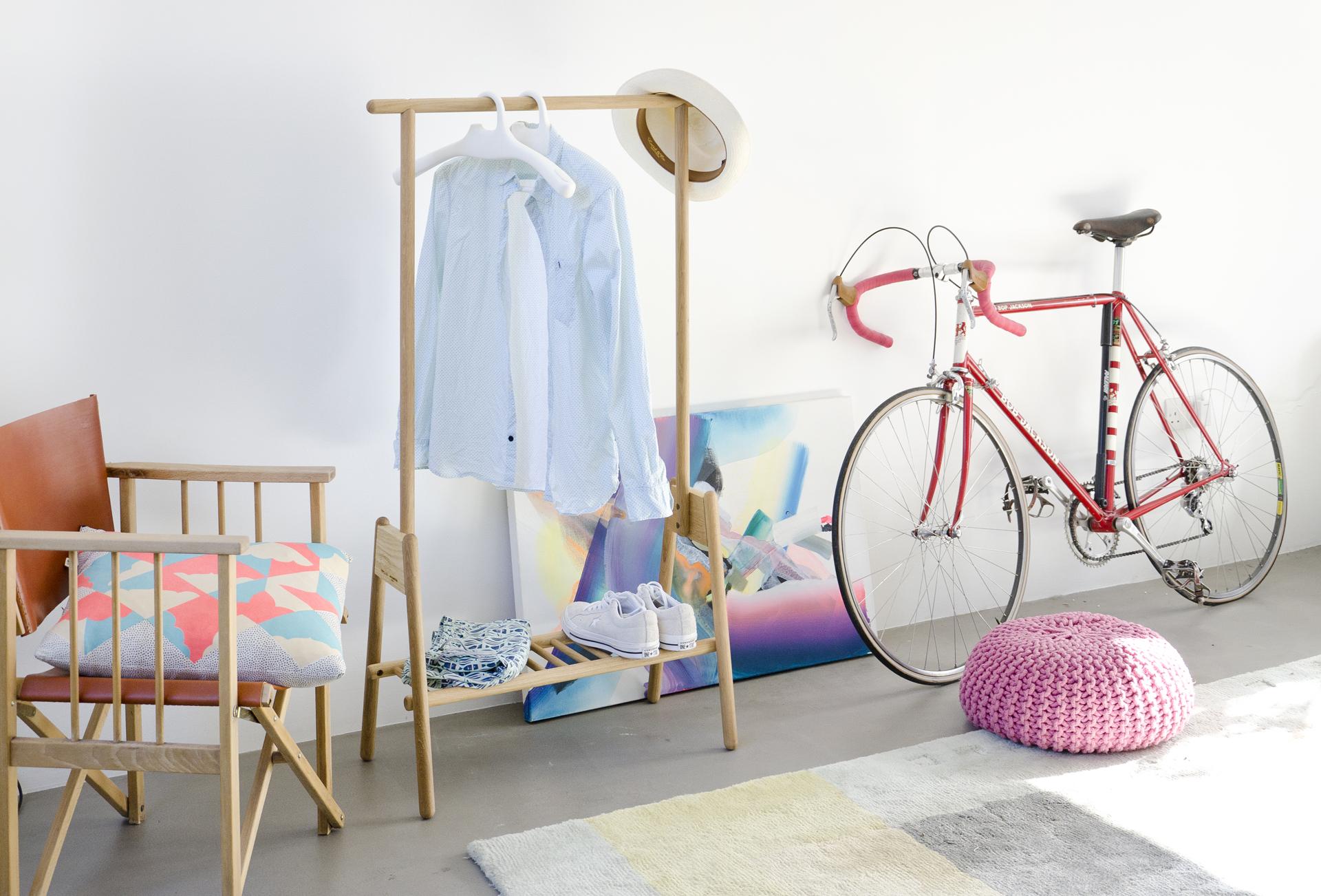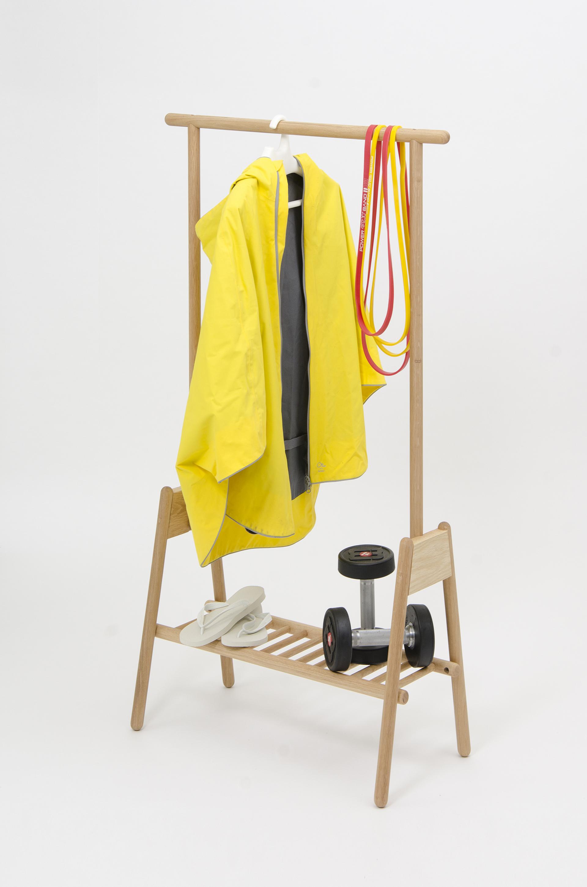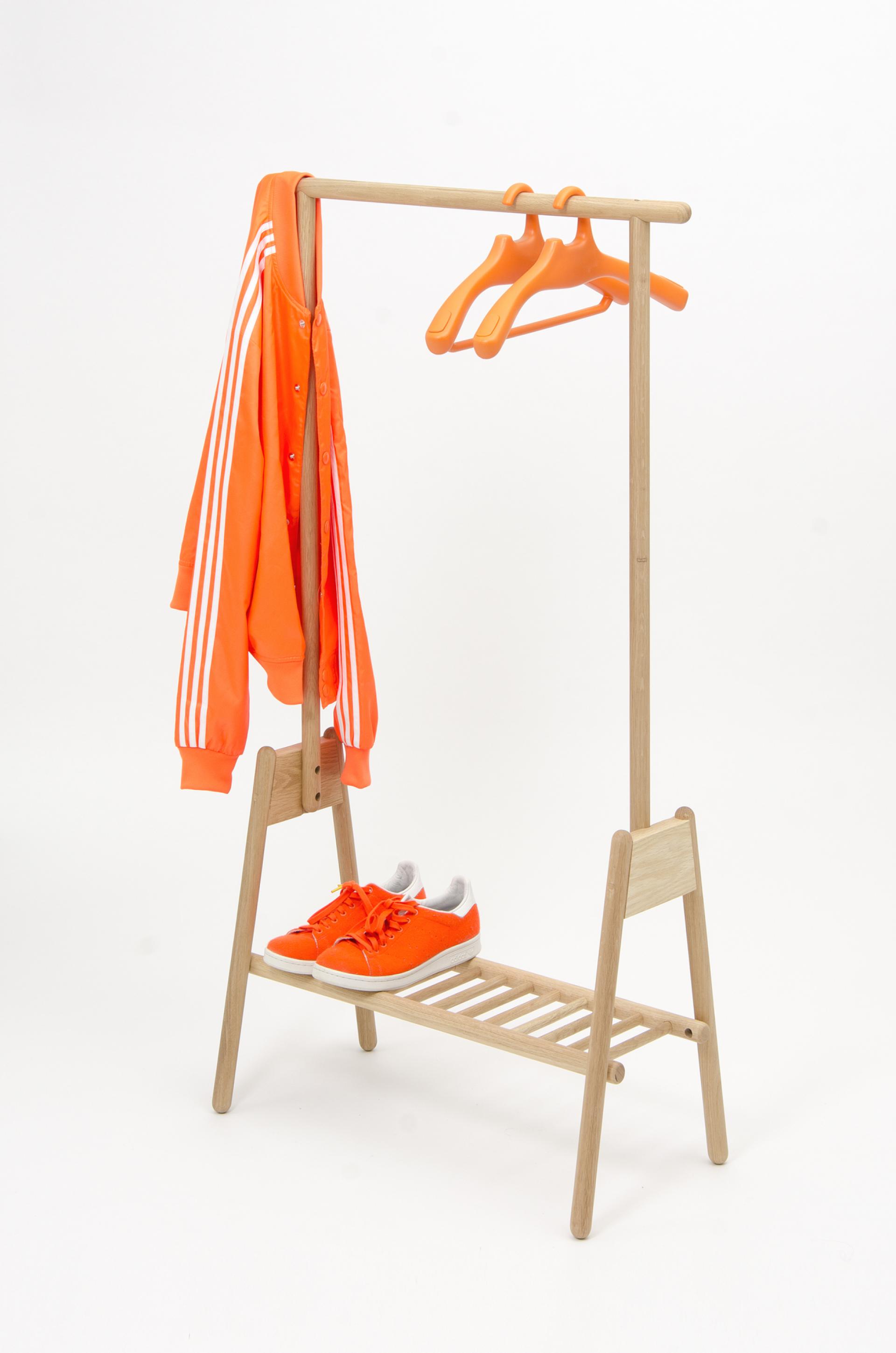 Hang up’s hanging rail scores full marks for function, utility and as a beautiful design. The rail is ideal for storing coats, shirts and dresses and the slatted shelf below can be used for folded items, shoes and boots. Underneath, there’s space for even more.