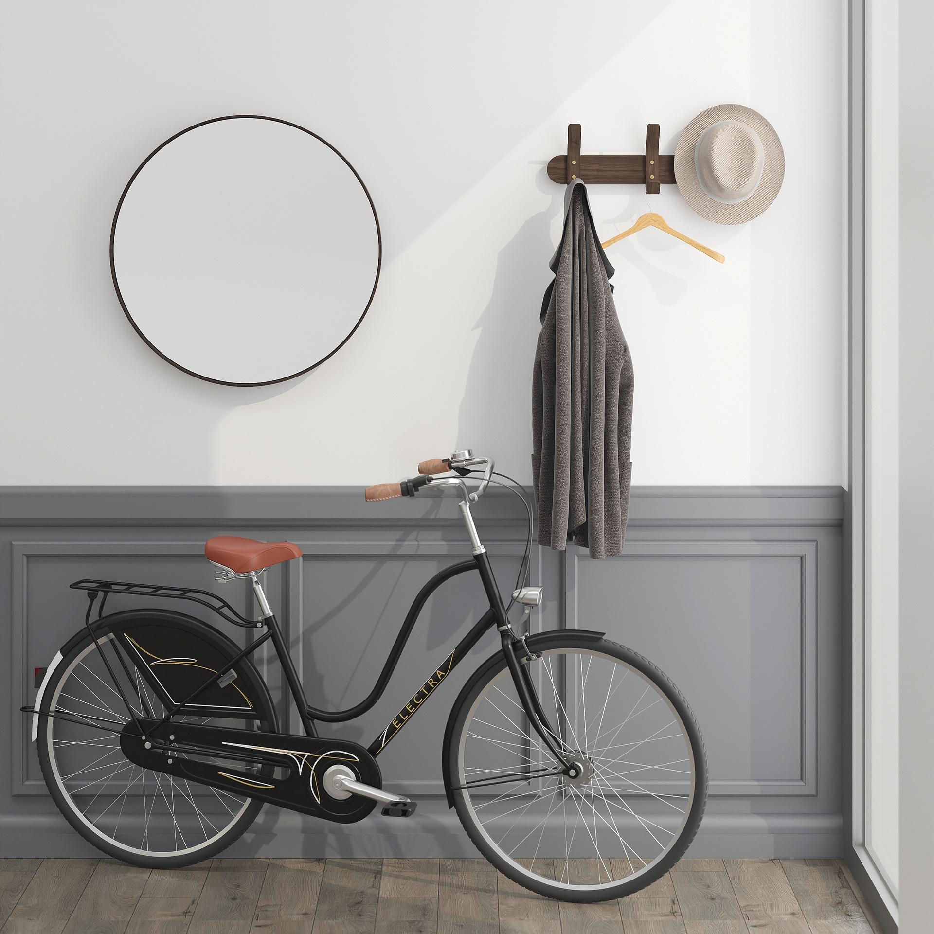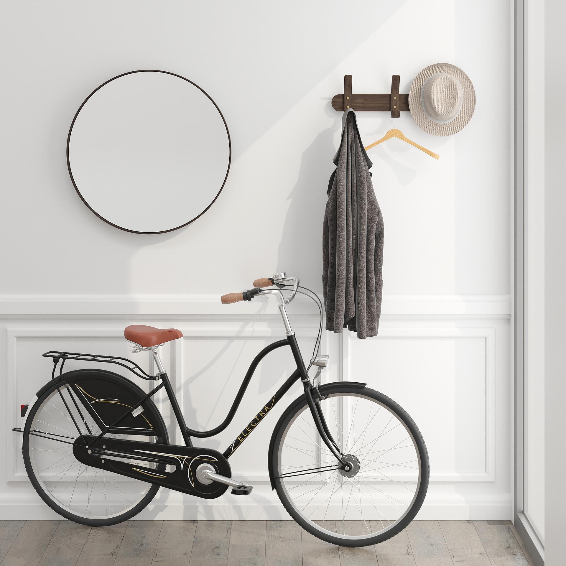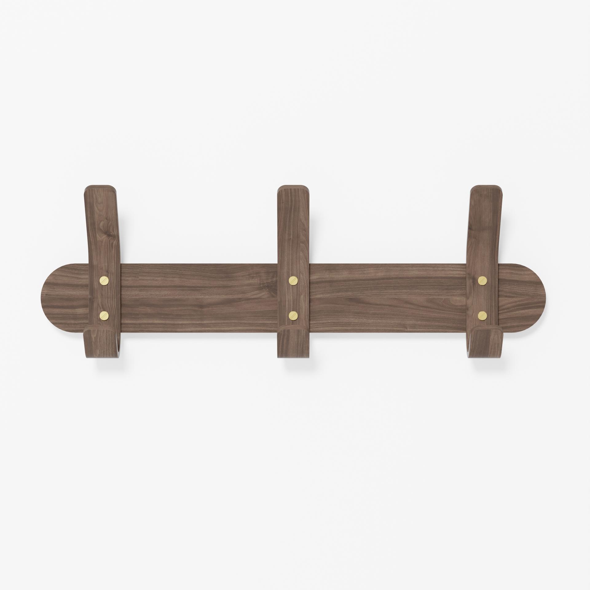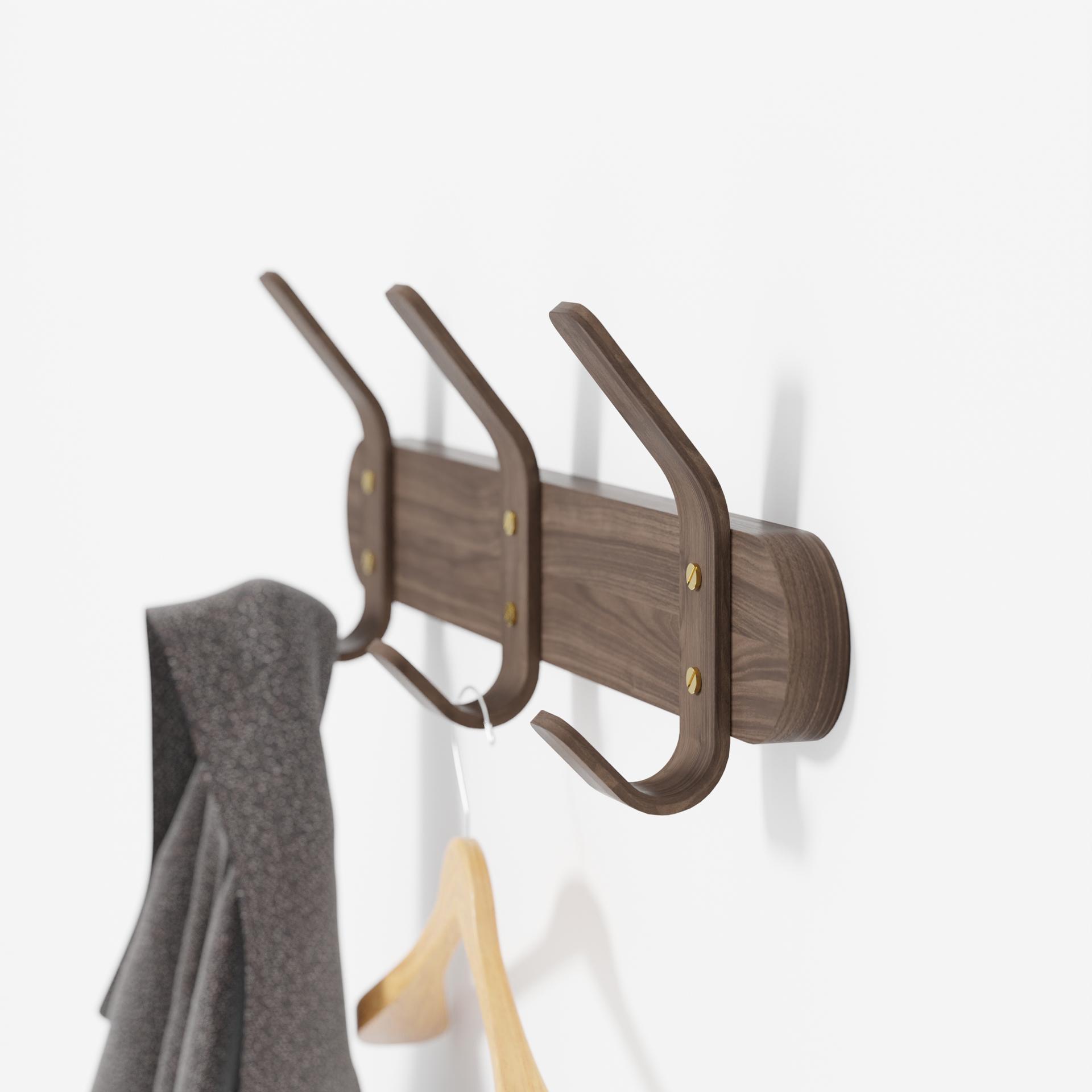 Coat rack 'Left hook 3' hanging rail features three double hooks, ideal for storing hats, coats and scarves. The wooden hook design is inspired by the classic metal hooks found in sports locker rooms and cloakroom areas. The hooks rounded edges prevent tearing and snags. The hook screws are bespoke brass and when fitting can be 'dressed'so they all align. The wall fixing screws are cleverley concealed and provide a very secure fix for the complete unit.