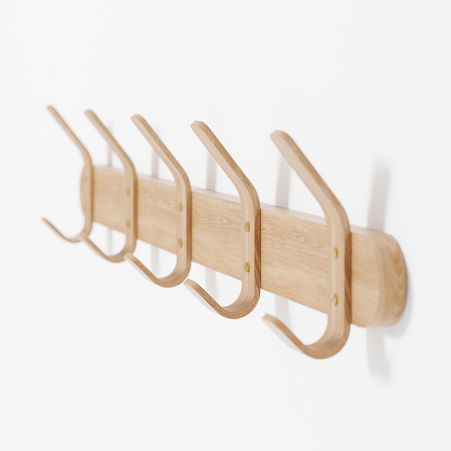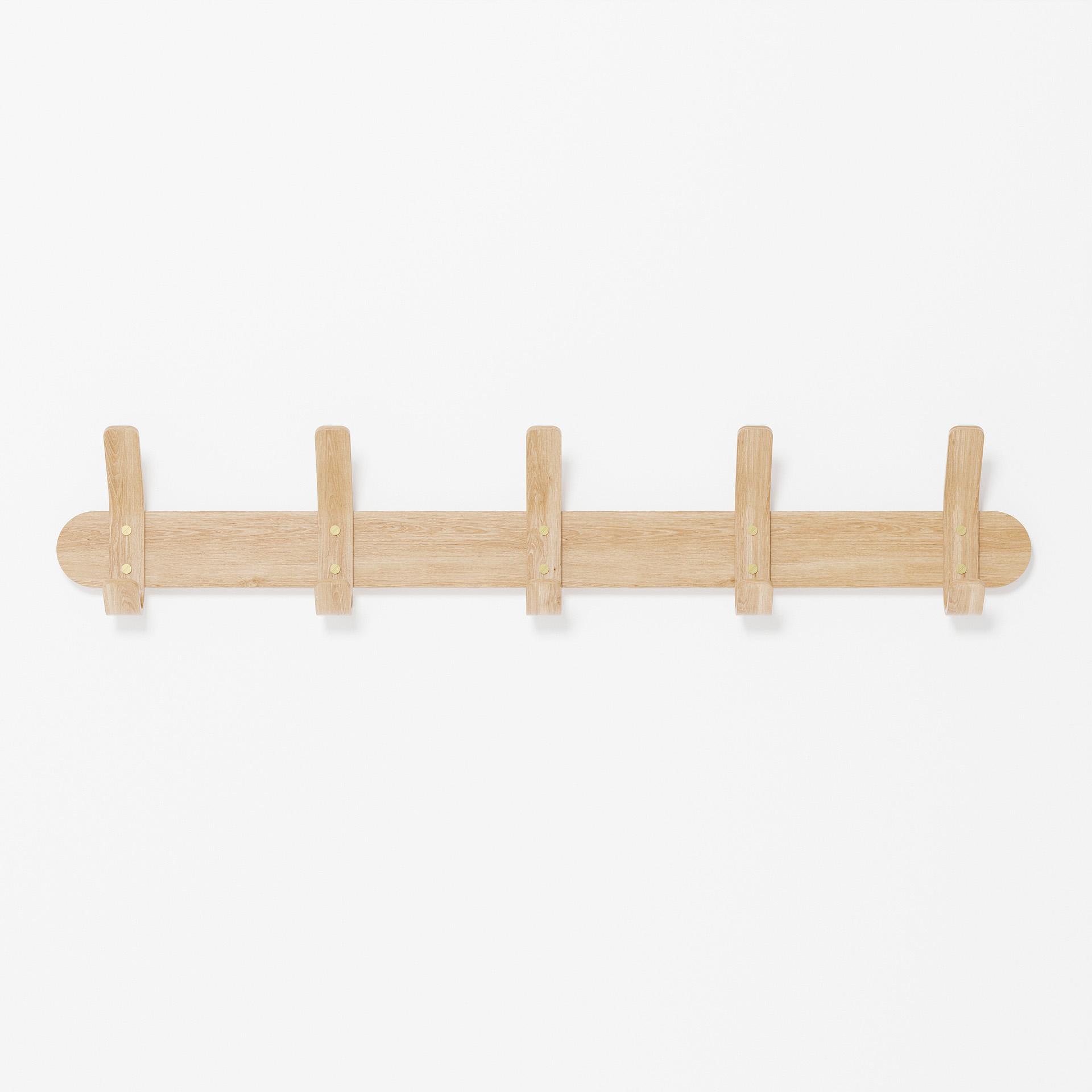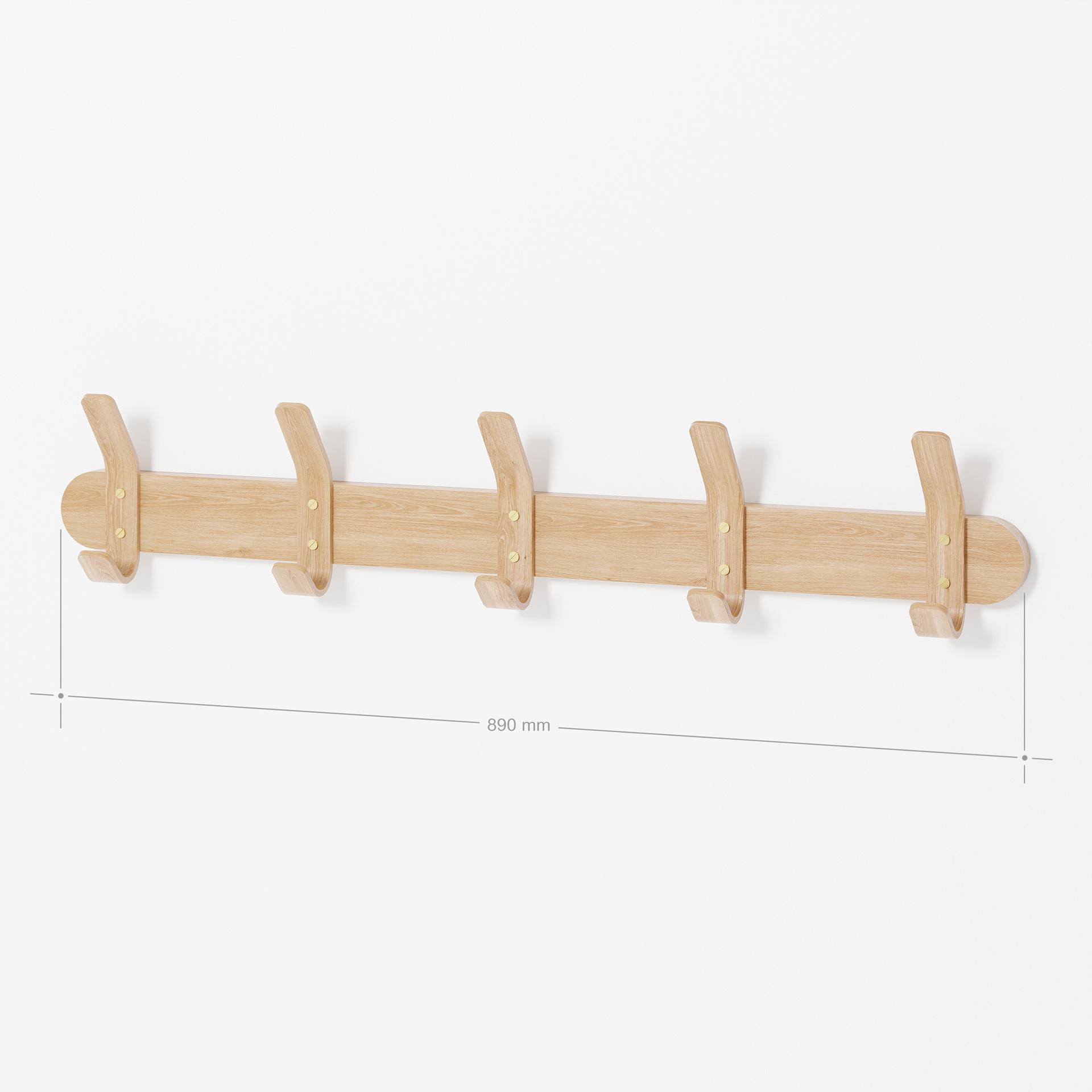 Left hook 5 hook hanging rail features five double hooks, ideal for storing hats, coats and scarves. The wooden hook design is inspired by the classic metal hooks found in locker rooms and cloakroom areas. The hooks rounded edges prevent tearing and snags. The hooks  screws are bespoke brass and when fitting can be 'dressed' so they all align.