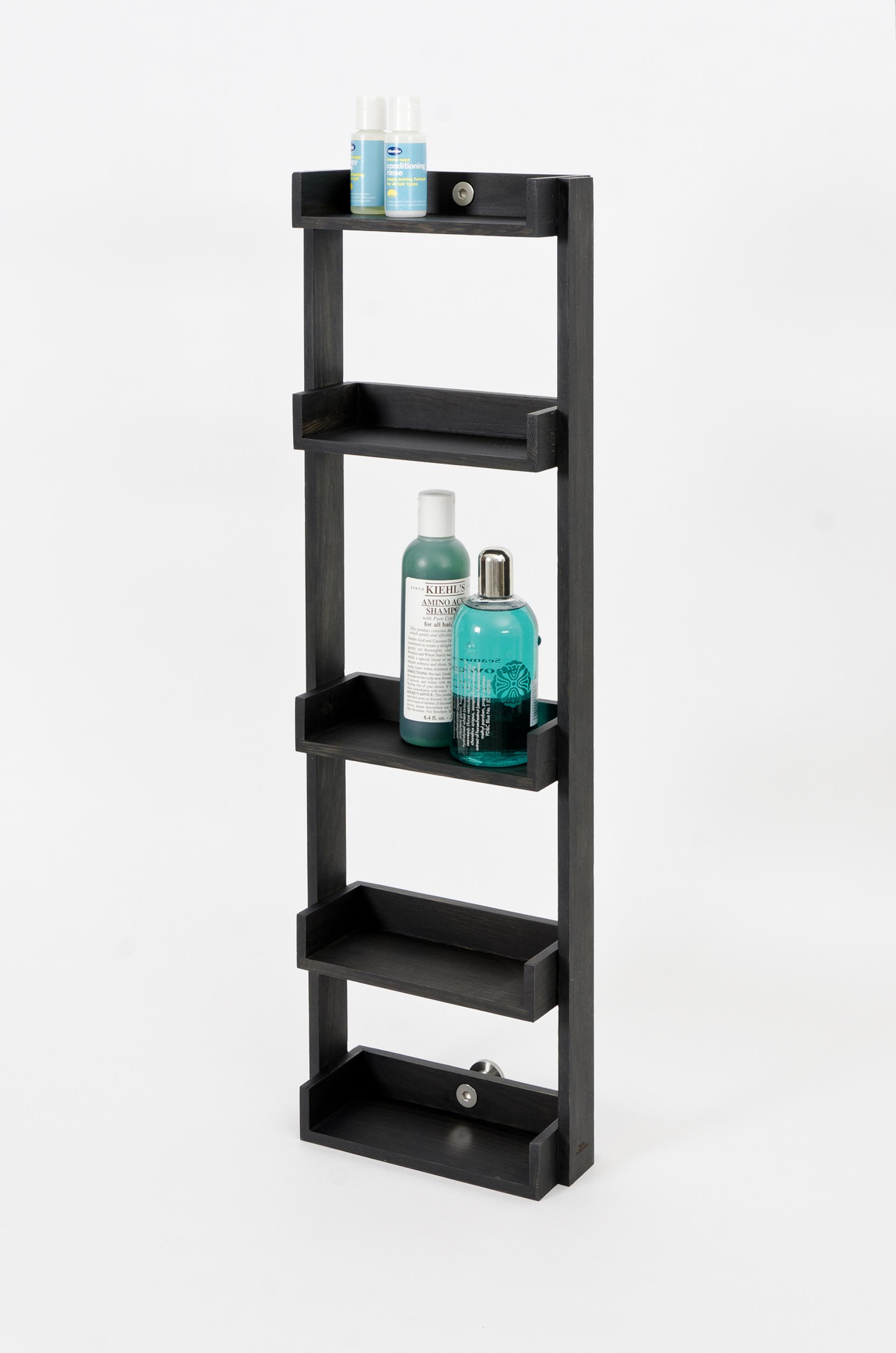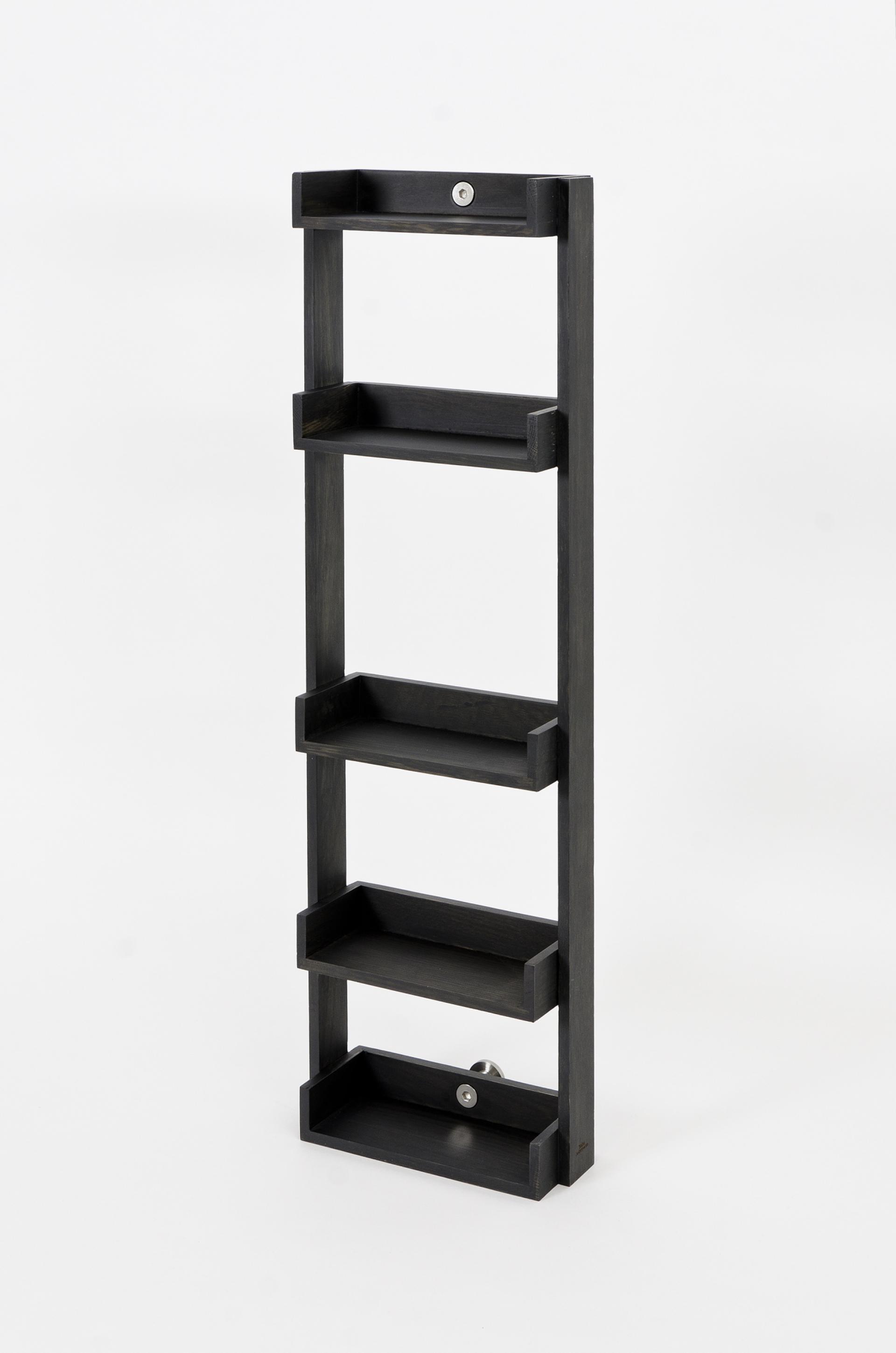 Yoku multi shelf wall storage design will hold bottles, creams, a scented candle or incense diffuser on it’s five shelves. The spacing between shelves is varied making it suitable for both tall and short items. Shelves are open at the front to make access easy but enclosed on the sides and back to stop things falling off. Fixings appear to float the shelves away from the wall. Perfect for slim spaces.