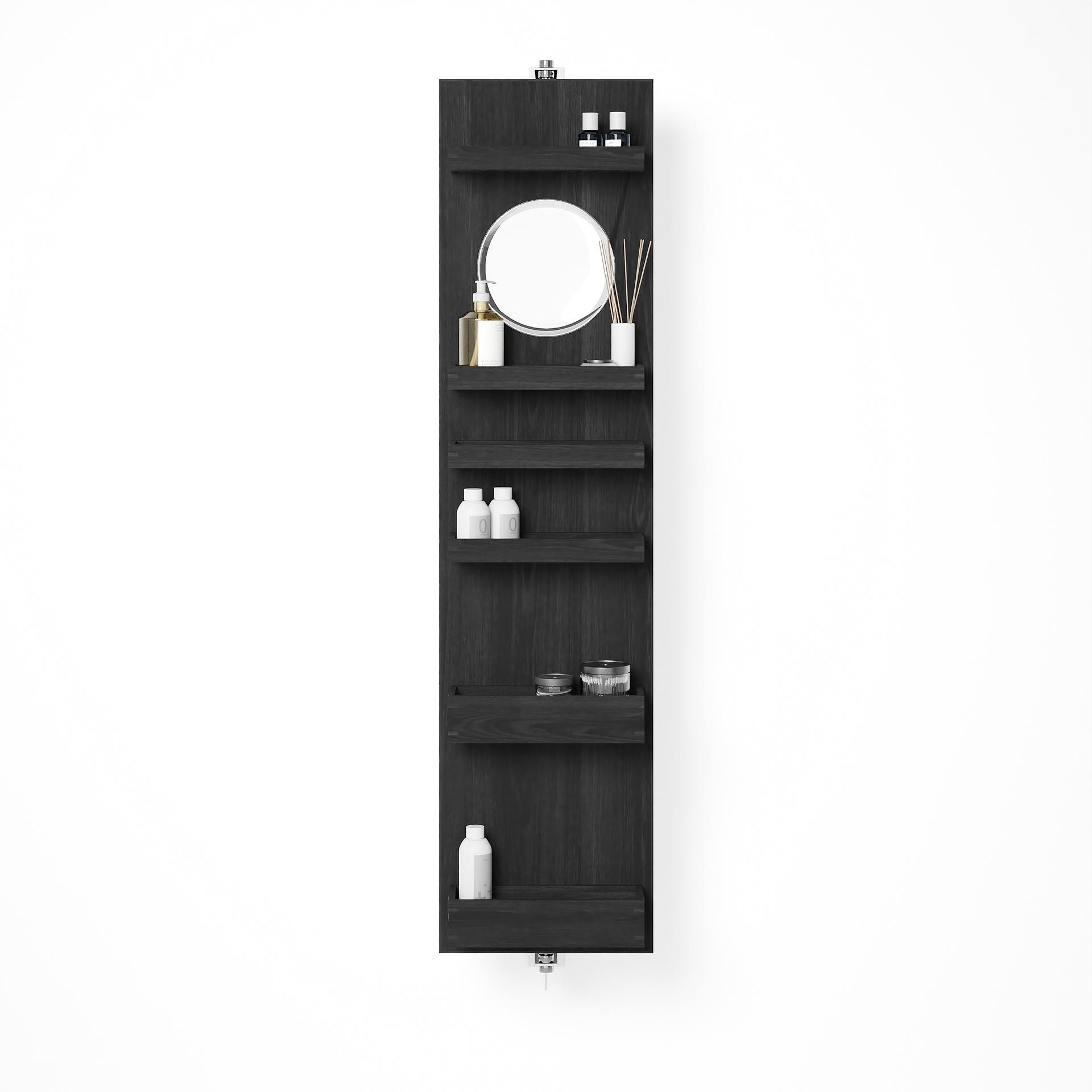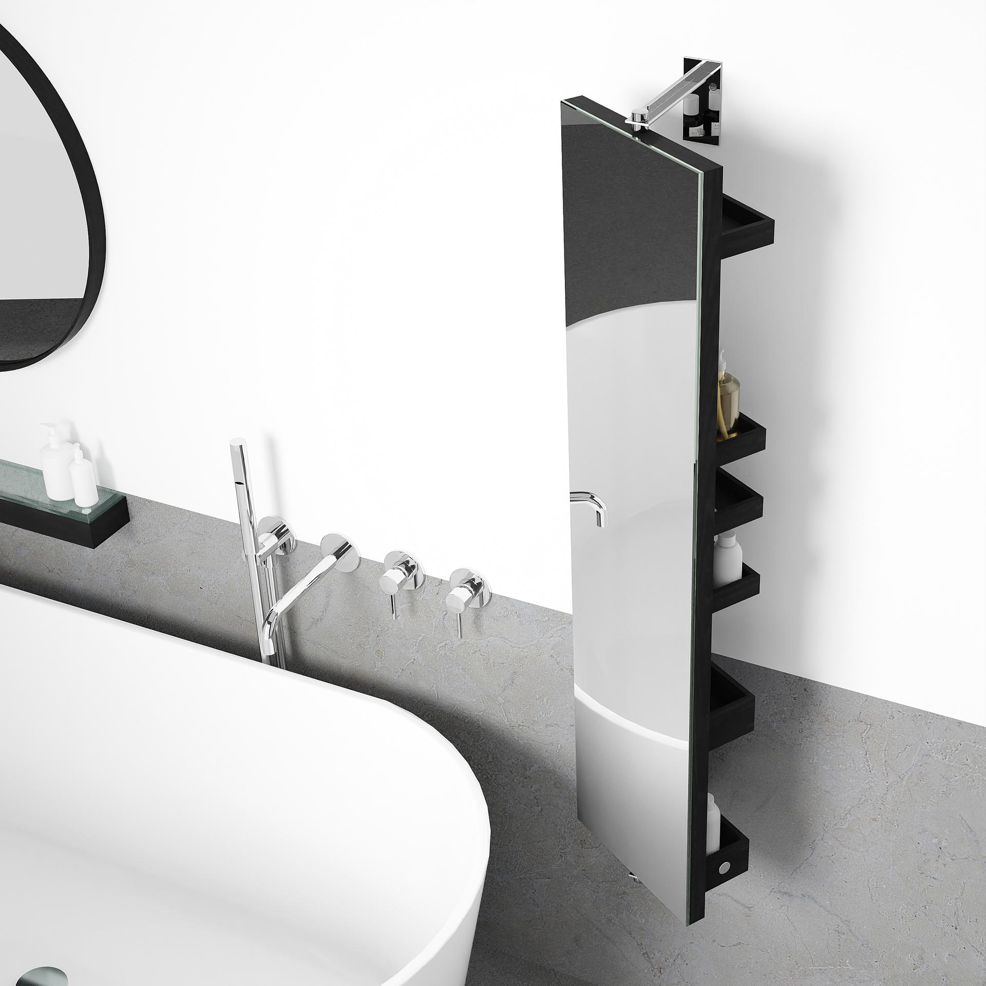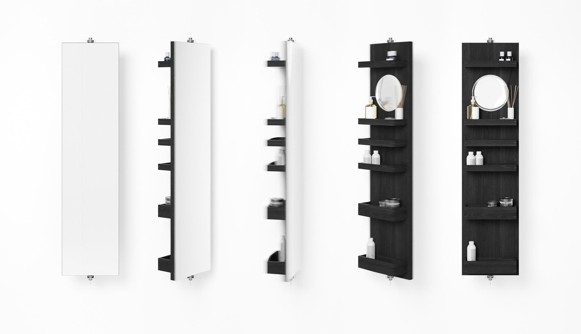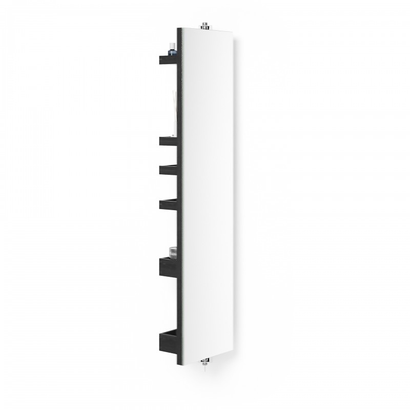 Cosmos revolve 1140 combines a number of desirable features in one highly evolved design. On one side is a full length dressing mirror (1140 x 280mm). On the other side, a round times five magnifying mirror (183mm diameter) gives a very close-up view. There are also six lipped edge storage trays for creams, bottles and lotions. The storage trays are staggered to provide efficient storage. Slim trays at the top are perfect for storing slim jars, lipsticks and pencils. Deep trays lower down are ideal for taller bottles and containers. Polished stainless steel wall brackets provide a secure fixing and the cabinet rotates smoothly making access effortless.