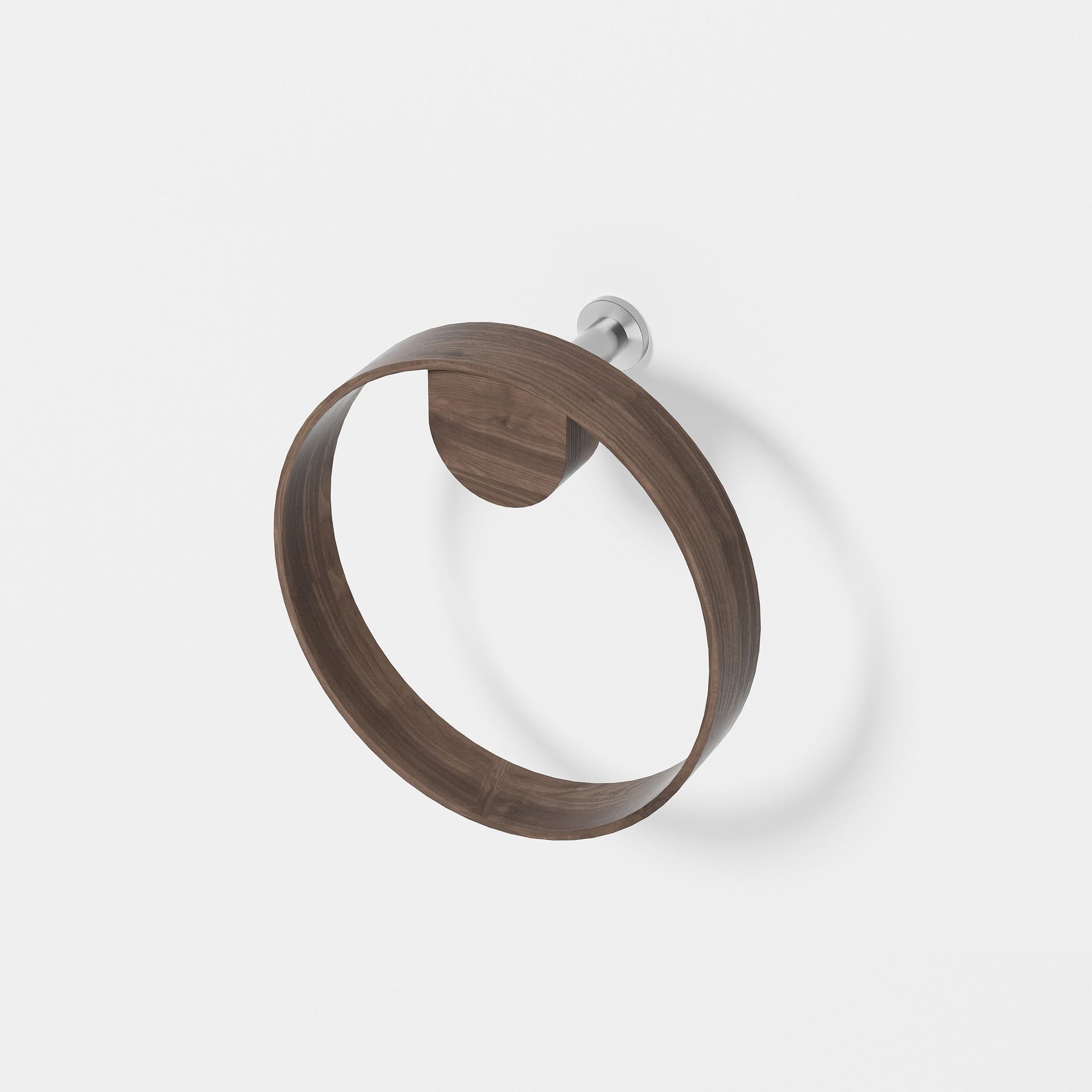 Yoku ring towel holder presents the hand towel elegantly away from the wall and allows space for air to circulate freely. The continuous loop holds towels securely.