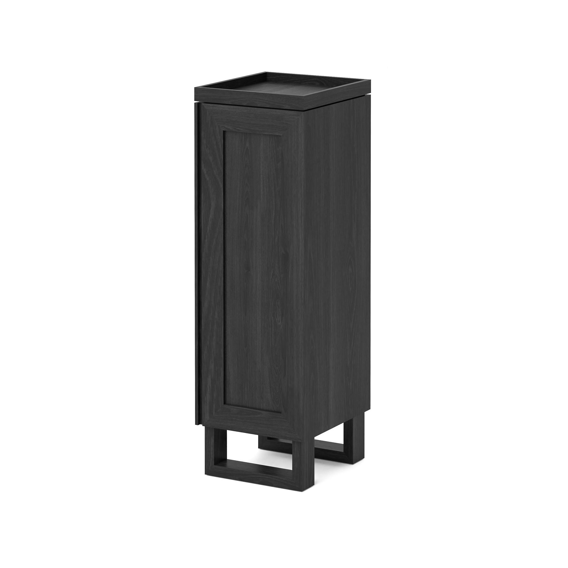 Mezza tallboy is made from sustainably harvested dark stained American white oak and oak veneers, selected for their depth of colour, beautiful grain pattern and traditional hardwood durability. All edges look crisp but are carefully hand sanded to make them soft to the touch. Finished with a matt, water resistant lacquer. Silicone feet stop it slipping. Design by Lincoln Rivers.