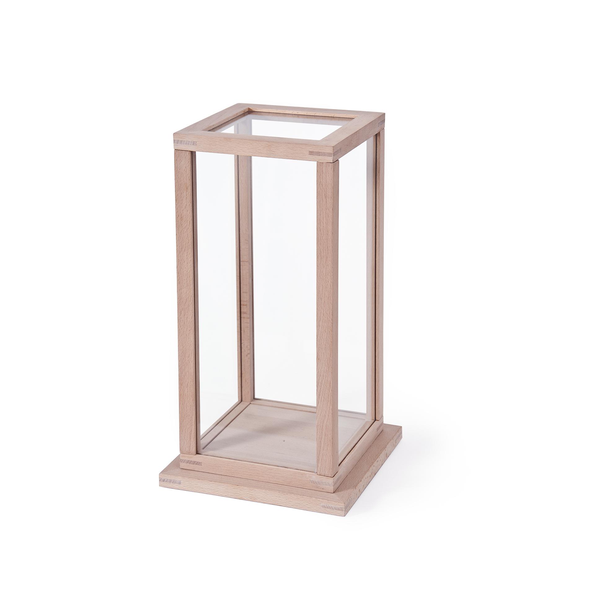 Made from sustainably harvested raw un-lacquered European beech wood with tempered glass sides and top. Edges look crisp but are finely hand sanded to make them soft to the touch.